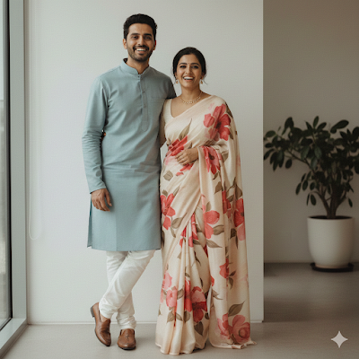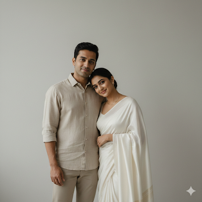 1) Create a clean and minimal portrait of an Indian couple.Male wearing a light beige shirt with neutral trousers.Female wearing an off-white saree with minimal accessories.Plain studio background in soft neutral tone.Soft natural lighting evenly spread.Calm romantic standing pose.Both facing camera with gentle smiles.Elegant and simple body language.No dramatic expressions or movements.Modern minimal Instagram aesthetic.Sharp facial features with realistic skin texture.Balanced exposure and soft contrast.Background completely distraction-free.High realism and professional finish.Do not change facial structure, keep faces realistic and consistent.
