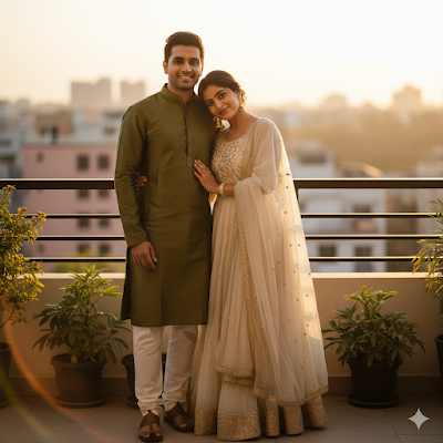 2) Create an Instagram-style couple portrait on a balcony.Male wearing an olive green kurta.Female wearing a cream or off-white ethnic outfit.Balcony background with city view.Golden hour sunlight falling softly.Warm and cozy lighting atmosphere.Relaxed standing pose close together.Female leaning slightly on male.Natural and peaceful expressions.Soft shadows with warm highlights.Romantic modern ethnic vibe.Clean color grading.Sharp focus with depth.High-quality square composition.Do not change facial structure, keep faces realistic and consistent.