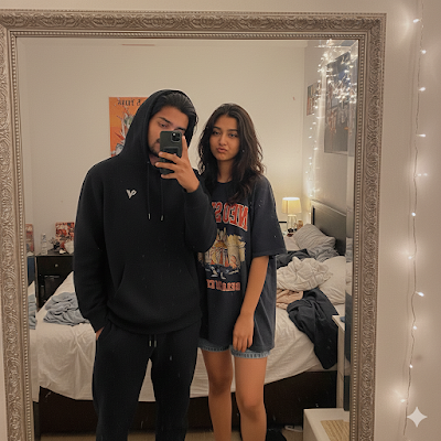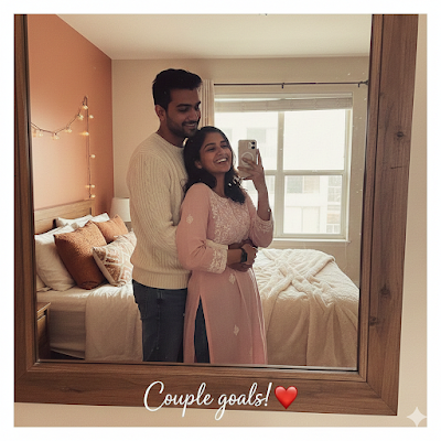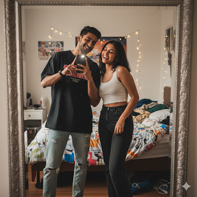 3) Create a fun indoor mirror selfie of a young Indian couple.Male wearing oversized t-shirt and casual jeans.Female wearing crop top with high-waist jeans.Bedroom mirror background.Casual playful standing pose.Both smiling and laughing naturally.Phone partially covering faces.Soft indoor room lighting.Messy room aesthetic allowed.Youthful and modern Gen Z vibe.Natural skin tones.Sharp focus with realistic texture.Instagram casual couple look.Square 1:1 image quality.Do not change facial structure, keep faces realistic and consistent.