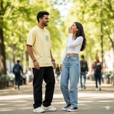 5) Create a fun and playful Indian couple photo for Instagram.Male wearing oversized t-shirt and sneakers.Female wearing crop top and baggy jeans.Captured mid-laughter during casual conversation.Open street or park background.Bright natural daylight with soft shadows.Youthful Gen Z vibe.Candid emotions with no forced posing.Natural body language and movement.Clean lifestyle photography look.Balanced color grading.Sharp facial details.High-quality square frame.Instagram-friendly aesthetic.Do not change facial structure, keep faces realistic and consistent.