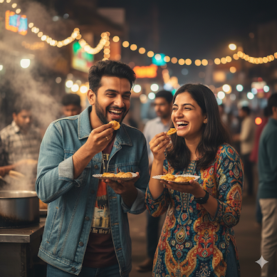 6) Create a vibrant Indian couple street food moment.Both laughing while eating street snacks.Casual everyday outfits suitable for night outing.Night market background with decorative lights.Warm artificial lighting creating bokeh effects.Candid unposed expressions captured naturally.Raw Indian lifestyle atmosphere.Natural hand movements while eating.Energetic cheerful mood.Faces clearly visible and well-lit.Sharp focus on the couple.Background softly blurred.Trending Instagram content style.High realism and texture detail.Do not change facial structure, keep faces realistic and consistent.