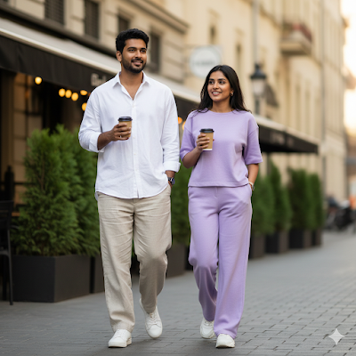 7) Create a modern lifestyle photograph of an Indian couple walking together.Male wearing an oversized white shirt paired with beige trousers.Female wearing a pastel co-ord set styled with white sneakers.Both holding takeaway coffee cups in their hands.Relaxed walking pose captured mid-step.Outdoor European-style street café background.Early morning natural daylight environment.Soft shadows with evenly balanced exposure.Natural body language and candid expressions.Clean modern lifestyle photography look.Background slightly blurred for depth separation.Realistic skin tones and fabric textures.Instagram trending aesthetic composition.Sharp focus with high clarity.Do not change facial structure, keep faces realistic and consistent.