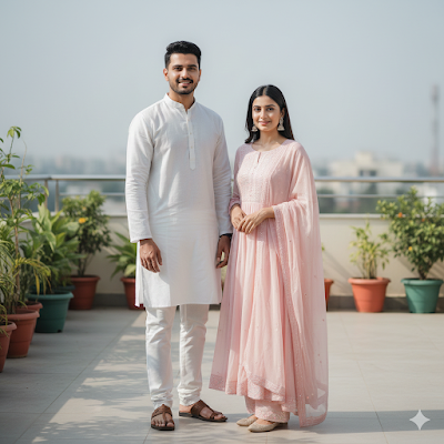 9) Create an Indian couple portrait in casual ethnic outfits.Male wearing a clean white kurta pajama.Female wearing a pastel pink salwar suit.Outdoor terrace background with potted plants.Bright soft sunlight during daytime.Standing side-by-side relaxed pose.Open airy mood with natural environment.Traditional yet modern Instagram look.Balanced lighting without harsh shadows.Clear separation from background.Sharp facial features and natural expressions.Realistic skin tones and outfit textures.Lifestyle photography style.High-resolution square frame.Do not change facial structure, keep faces realistic and consistent.